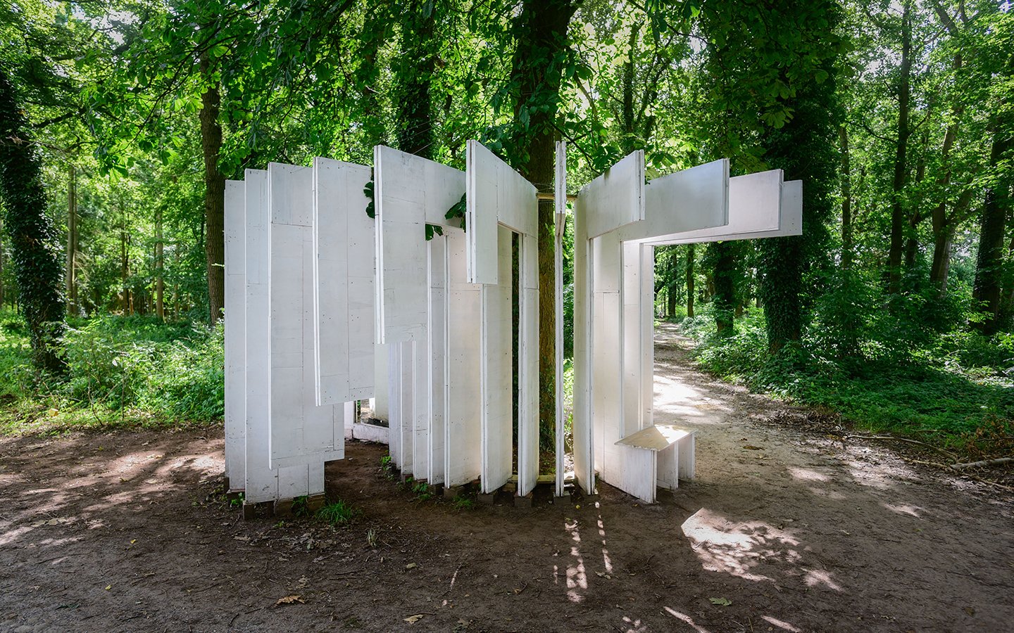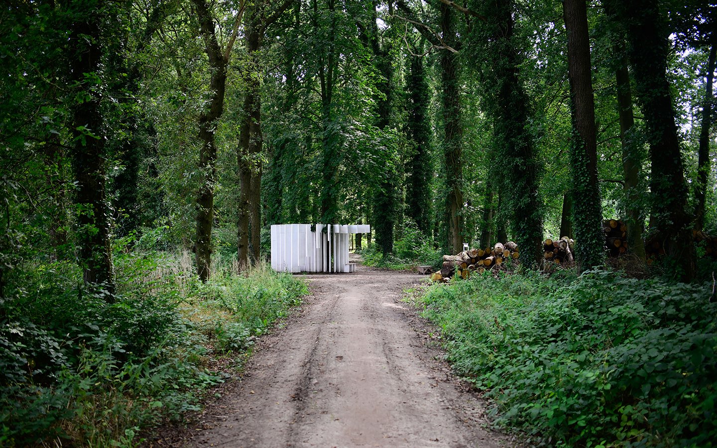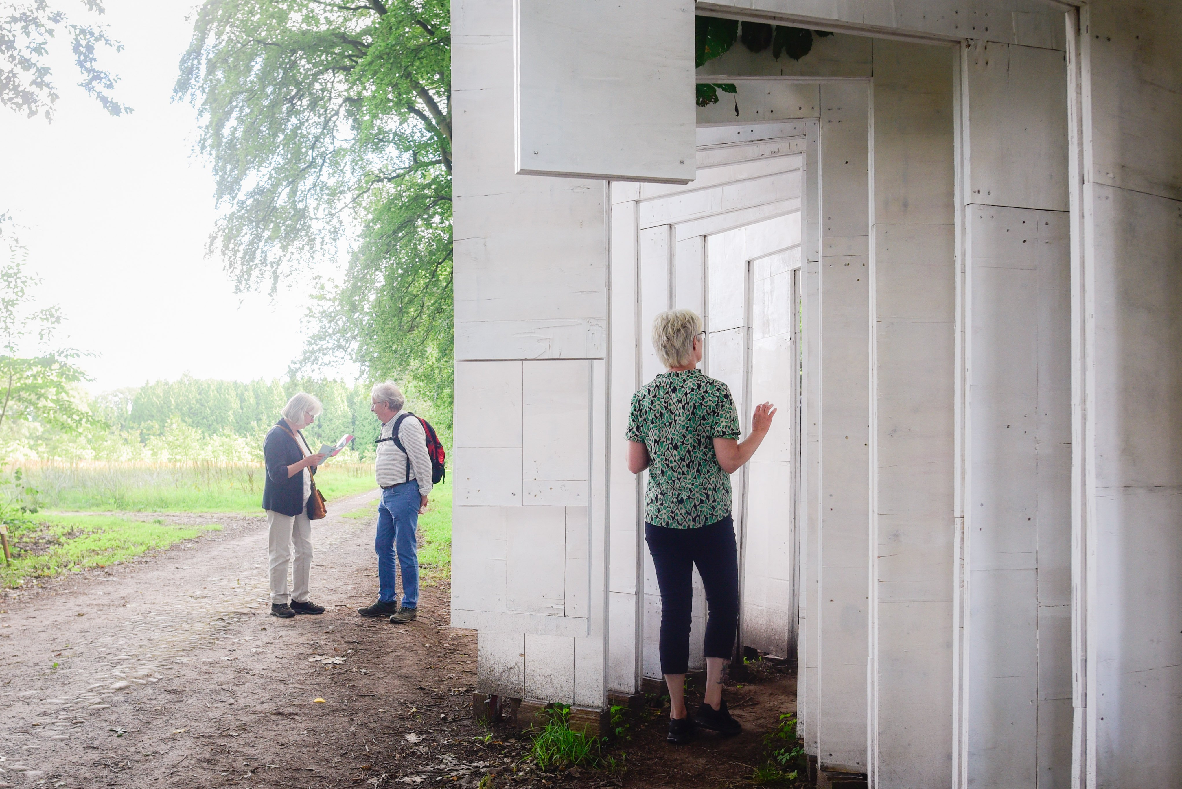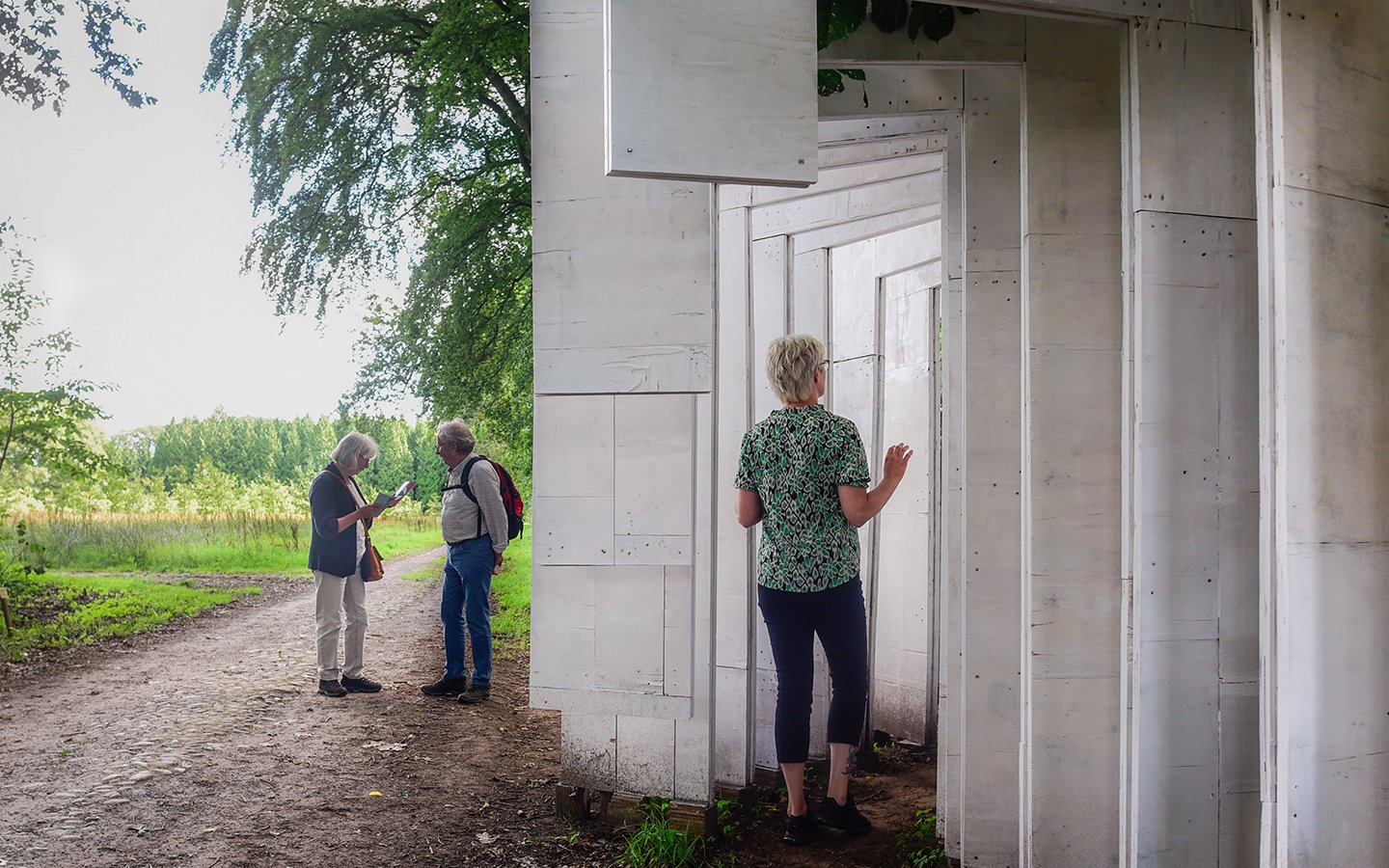 Een verhaal. Iedereen heeft een verhaal. Maar door de drukte van de wereld waarin we leven, verliezen we onszelf soms in het collectief. We vergeten te kijken en te luisteren. Naar de wereld, naar elkaar, en naar onszelf. Wij als mens houden ons dagelijks bezig met onze plek op de wereld, en wat wij kunnen doen om bij te dragen aan een beter milieu. We merken vaak dat het makkelijk is om te vergeten dat ieder individu hier iets aan bij kan dragen, dat alle kleine beetjes wel echt helpen. We zouden graag meer bewustzijn willen creëren voor ieders eigen verhaal in het collectief, en het belang van ieders eigen bijdrage aan een betere wereld. Onze folly vertelt dit verhaal. En met haar verhaal helpt ze jou op zoek te gaan naar jouw eigen verhaal. Omsloten Ontmoeting vertelt een verhaal over ons allemaal. Haar witte strakke vlakken vormen een scherp contrast met haar omgeving. Als de mens en de natuur. Ze maakt ons bewust van onze omgeving, en vraagt je na te denken wat de natuur voor jouw betekent. Wat is jouw plek in deze wereld? Ga zitten en kom tot rust, met uitzicht op de omringende landschap. Word nieuwsgierig en laat je leiden door de Folly. Laat je omarmen. Wanneer je de folly in loopt verdwijnt het zicht op de natuur en wordt alles geleidelijk wit. Wat blijft er over als de natuur verdwijnt? Wat is onze rol hierin? Langzaam word je helemaal omsloten door de folly en zie je alleen nog maar wit. Aan het eind is een spiegel. Wat zie je daar? Een ontmoeting met jezelf. Waar sta jij in deze wereld, wat is jouw verhaal?