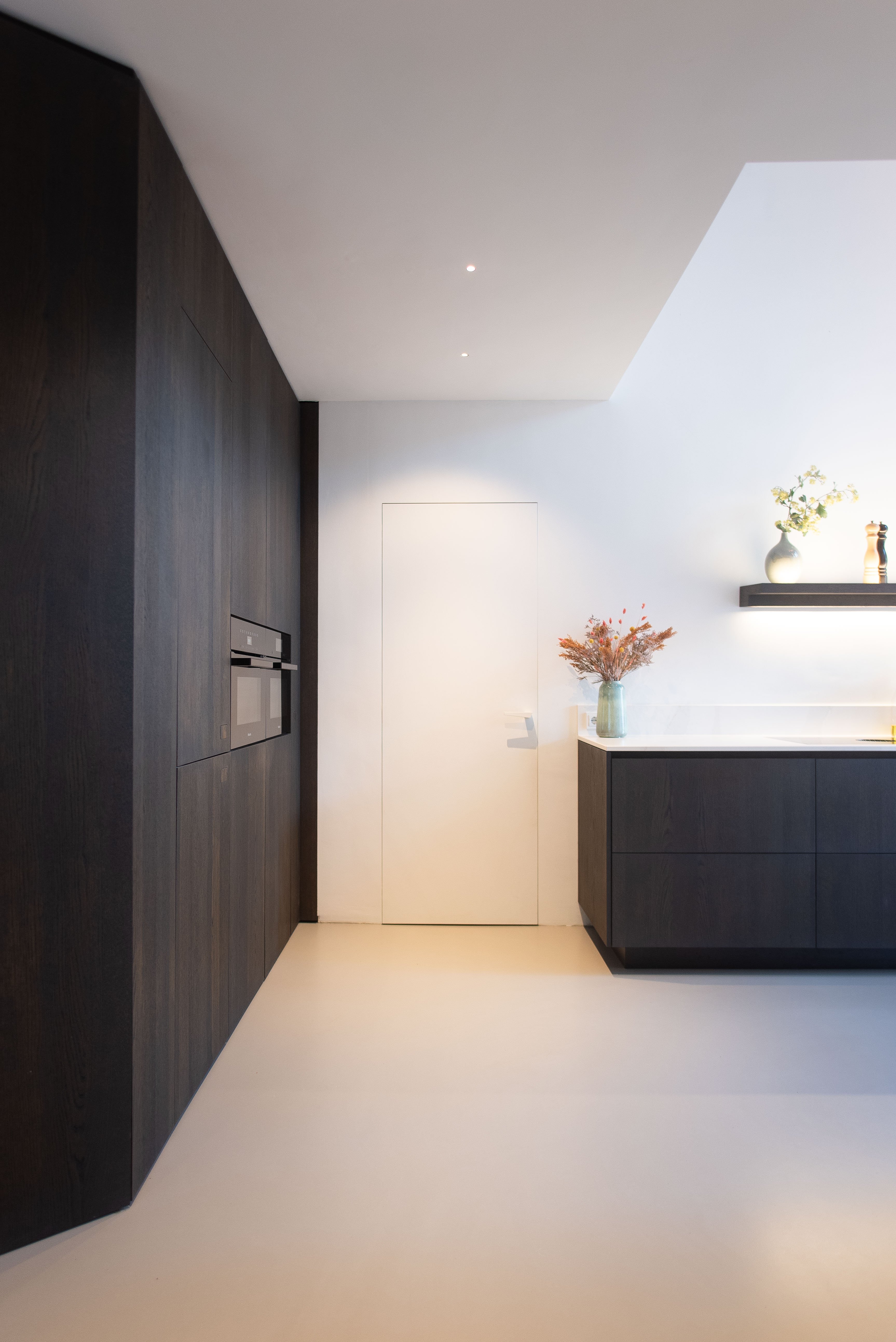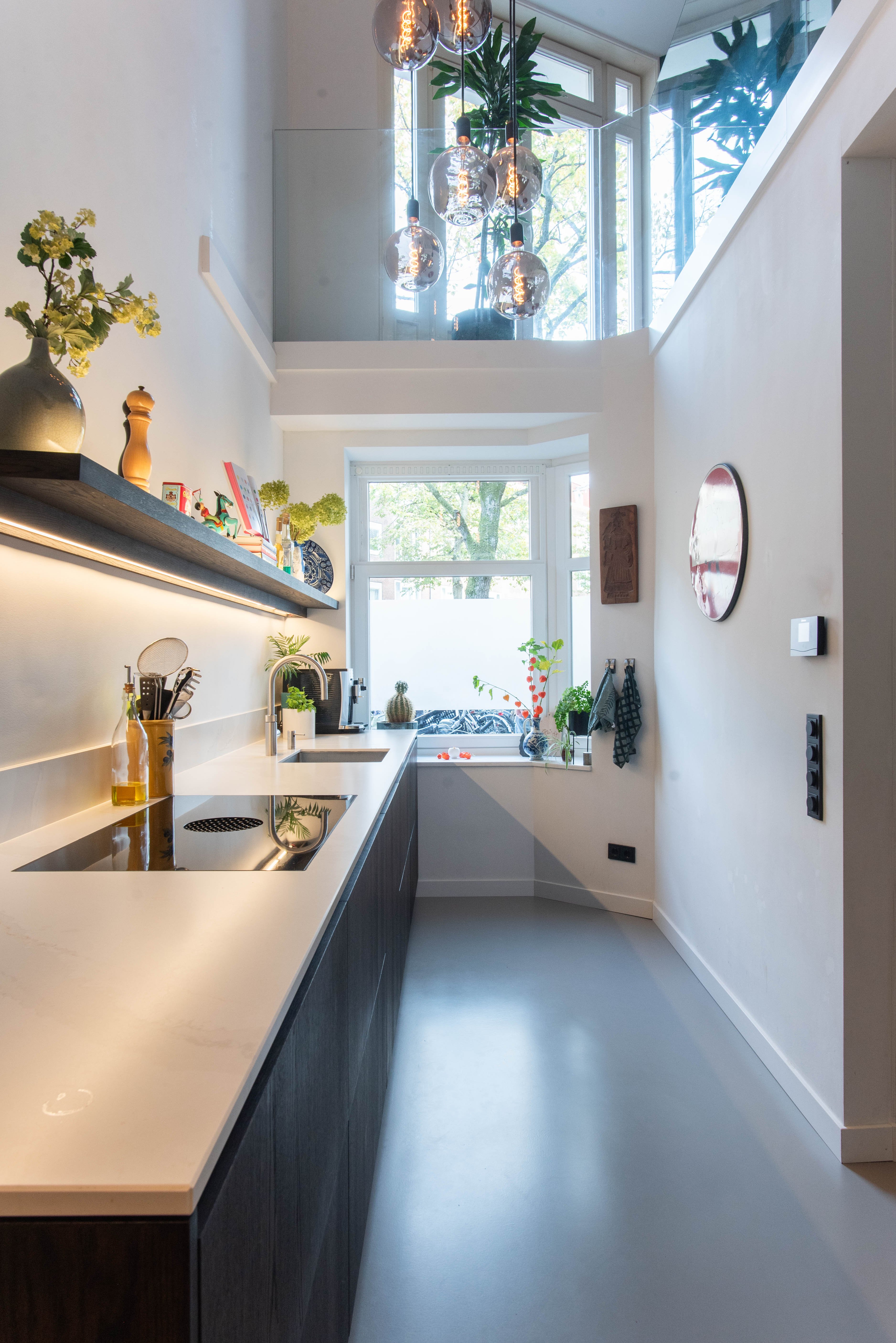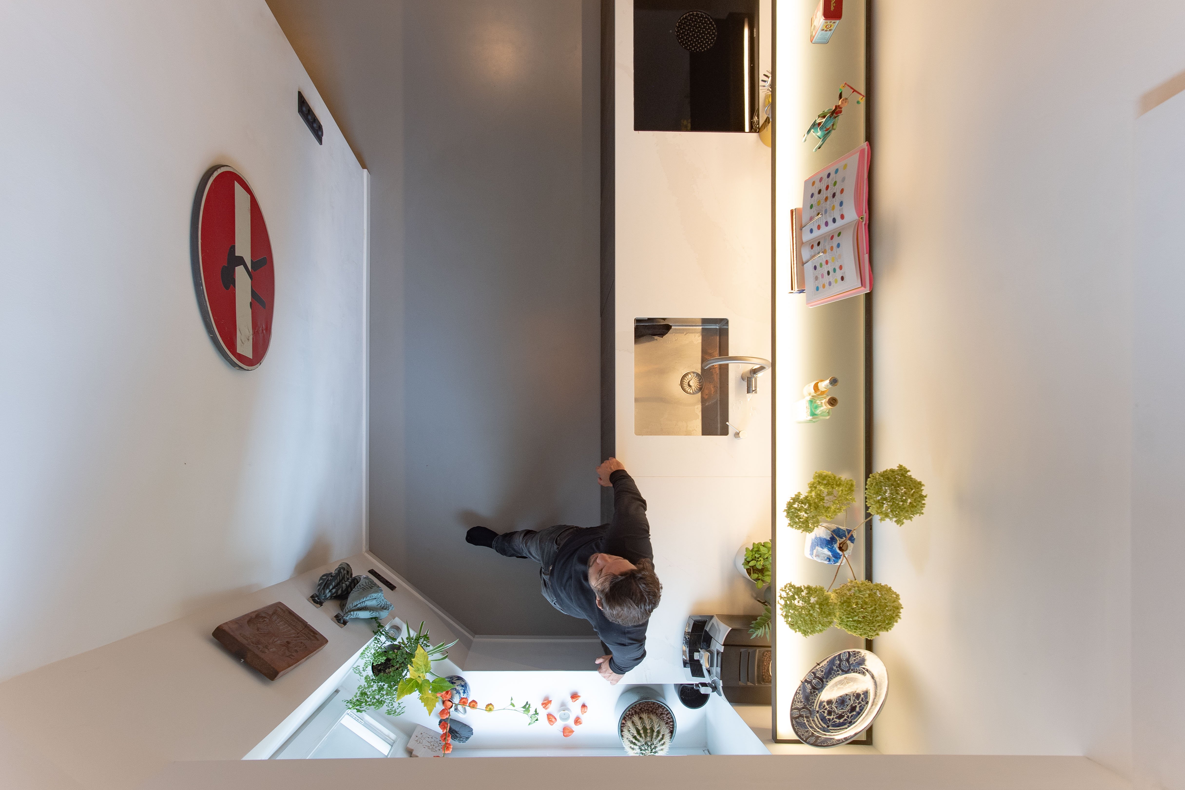 Om een goede verbinding te realiseren in een pand met drie verdiepingen, werd een vide gecreëerd boven de keuken. Dit ontwerp voegde niet alleen een visuele verbinding tussen de woonlagen toe, maar zorgde ook voor een flinke verbetering van de ruimtelijke kwaliteit. Wat voorheen het donkerste deel van de woning was, veranderde in een centrale, lichte ruimte die de verdiepingen op een natuurlijke manier met elkaar verbindt. Het resultaat is een harmonieus geheel waarin ruimte en licht optimaal benut worden.