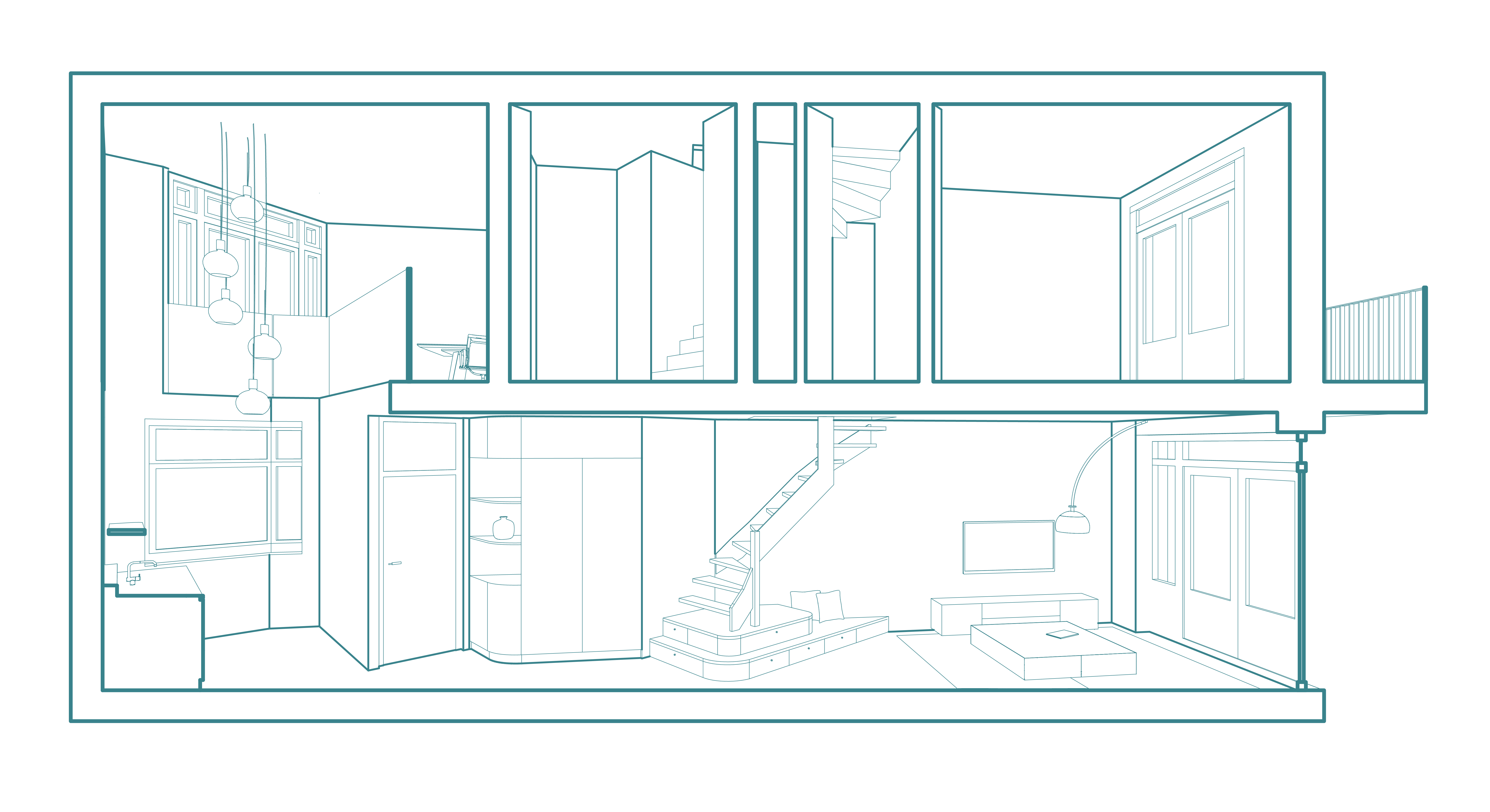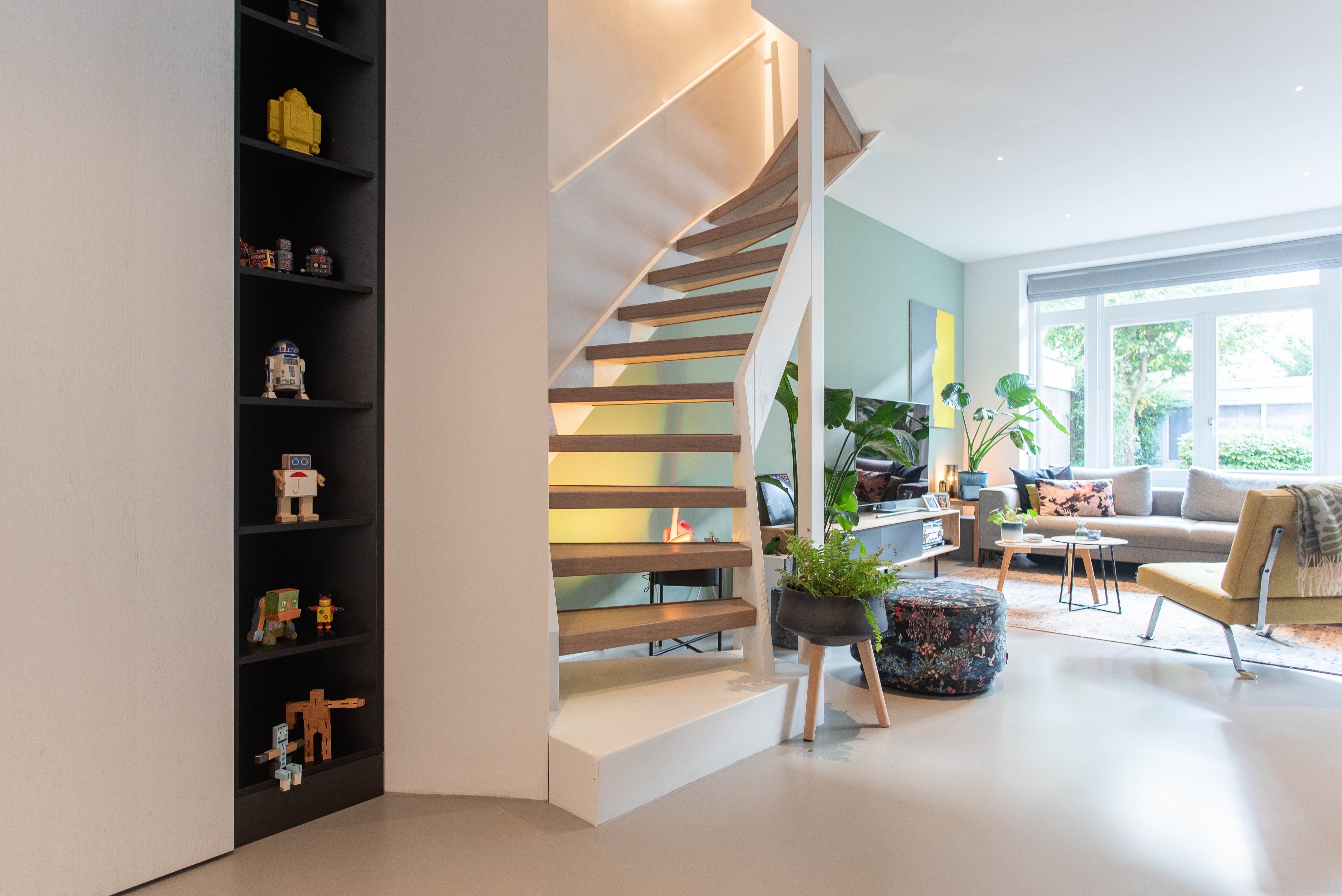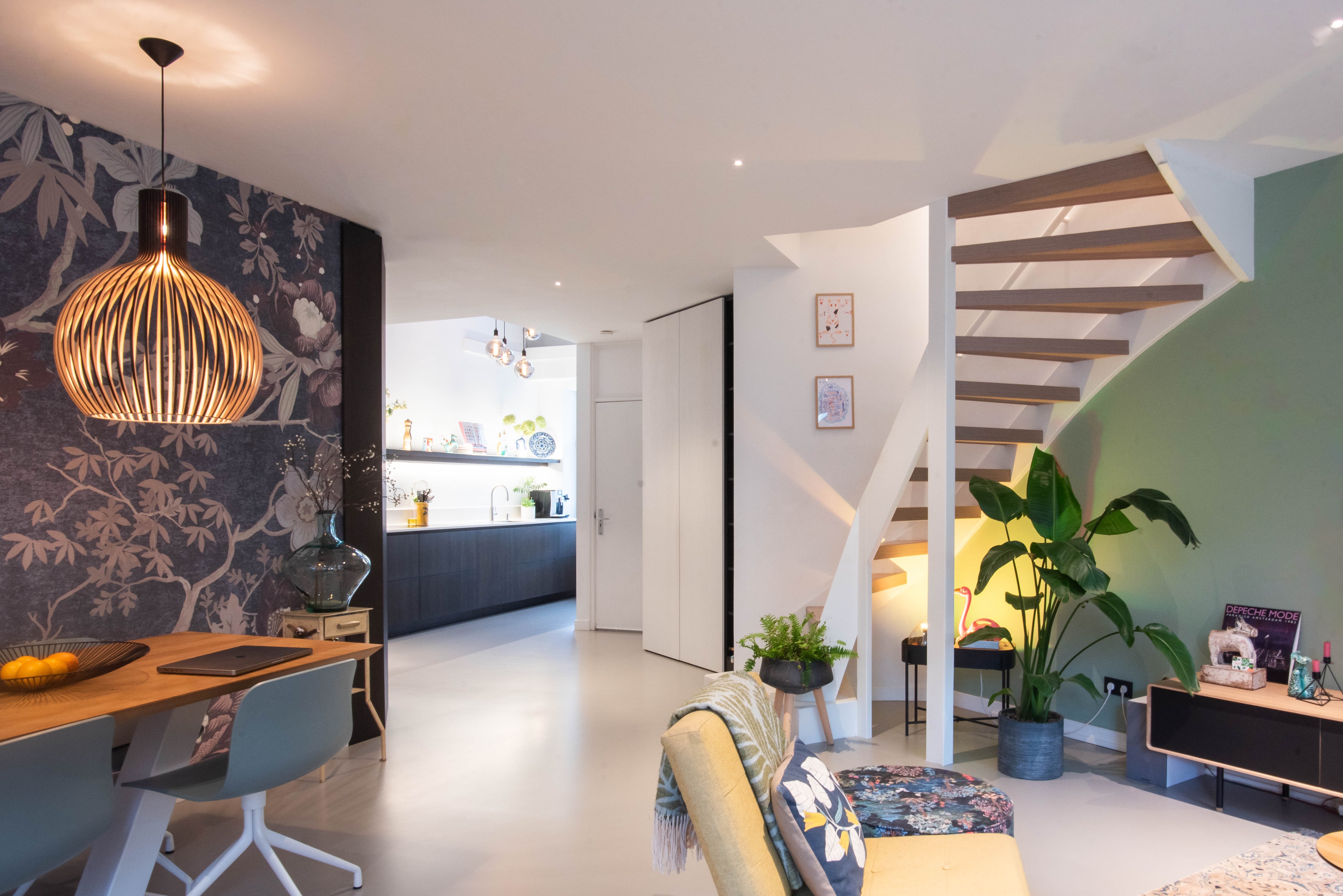 De opdrachtgever kreeg de unieke kans om de bovenliggende woning aan te kopen en zo twee woningen in hetzelfde pand samen te voegen tot één geheel. Deze gelegenheid bracht een bijzondere uitdaging met zich mee: hoe creëer je een samenhangend interieur en een logische connectie tussen twee zelfstandige woningen? De vraag leidde tot een totaal interieurplan waarin niet alleen praktische oplossingen, maar ook sfeer en esthetiek centraal stonden.