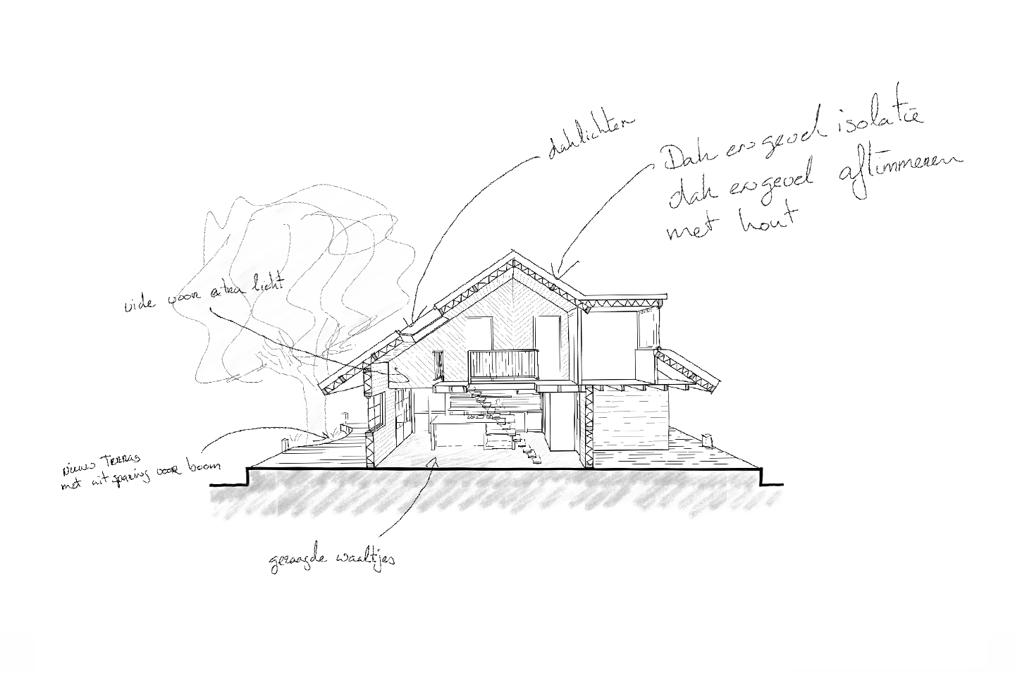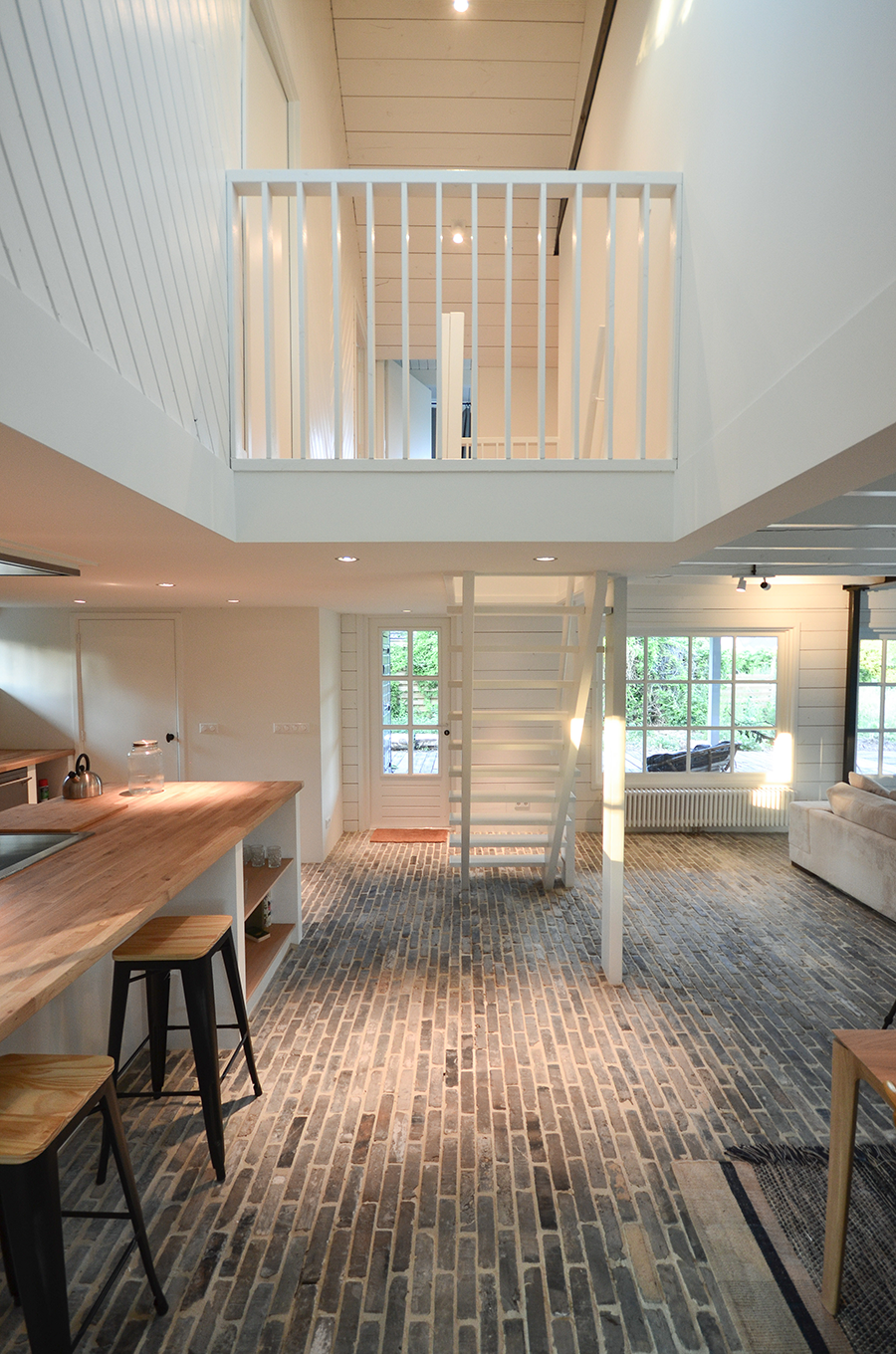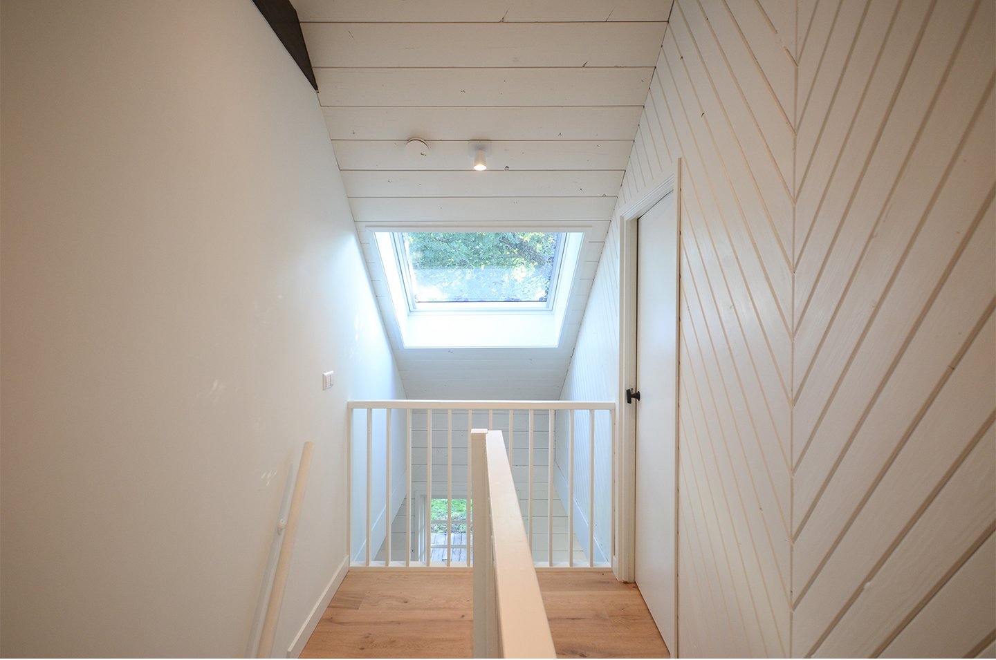 Op de begane grond zijn de muren weg gebroken waardoor een ruime woonkamer met open keuken is ontstaan. Het plafond is open gemaakt om de constructie zichtbaar te maken en tegelijkertijd meer lucht te creëren. De vloer is belegd met gezaagde waaltjes en de muren zijn voorzien van geschilderde houten planken. Er zijn extra toegangen naar het terras gemaakt en ter plaatse van de trap is een vide gezaagd voor een verbinding met de 1e verdieping. Op de eerste verdieping zijn 4 slaapvertrekken gerealiseerd. De masterbedroom is voorzien van een rond venster welke uitzicht geeft op de omliggende natuur. Het dak is hoogwaardig geïsoleerd en net zoals de muren afgetimmerd met geschilderde houten planken. Dit geeft een sterk lijnen spel en levendig karakter aan de woning.