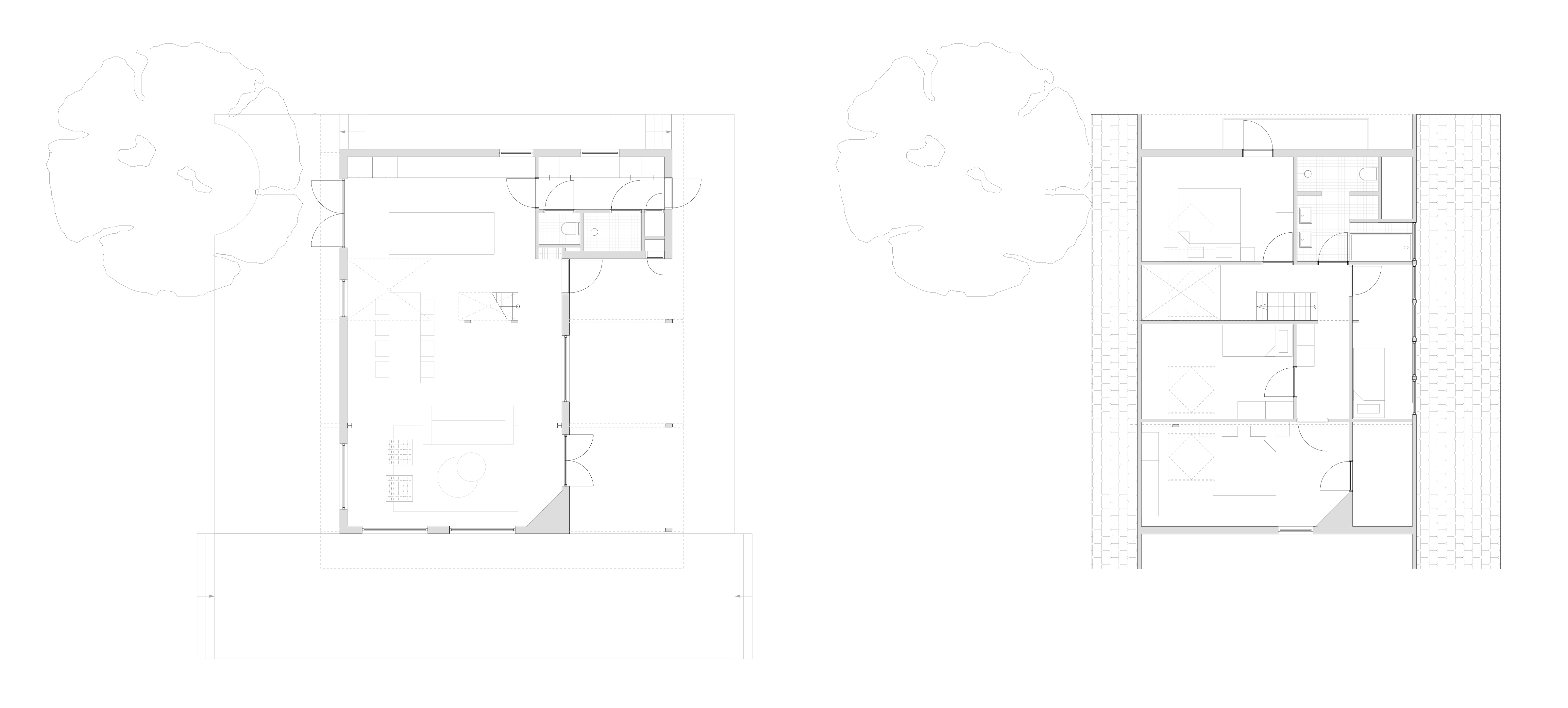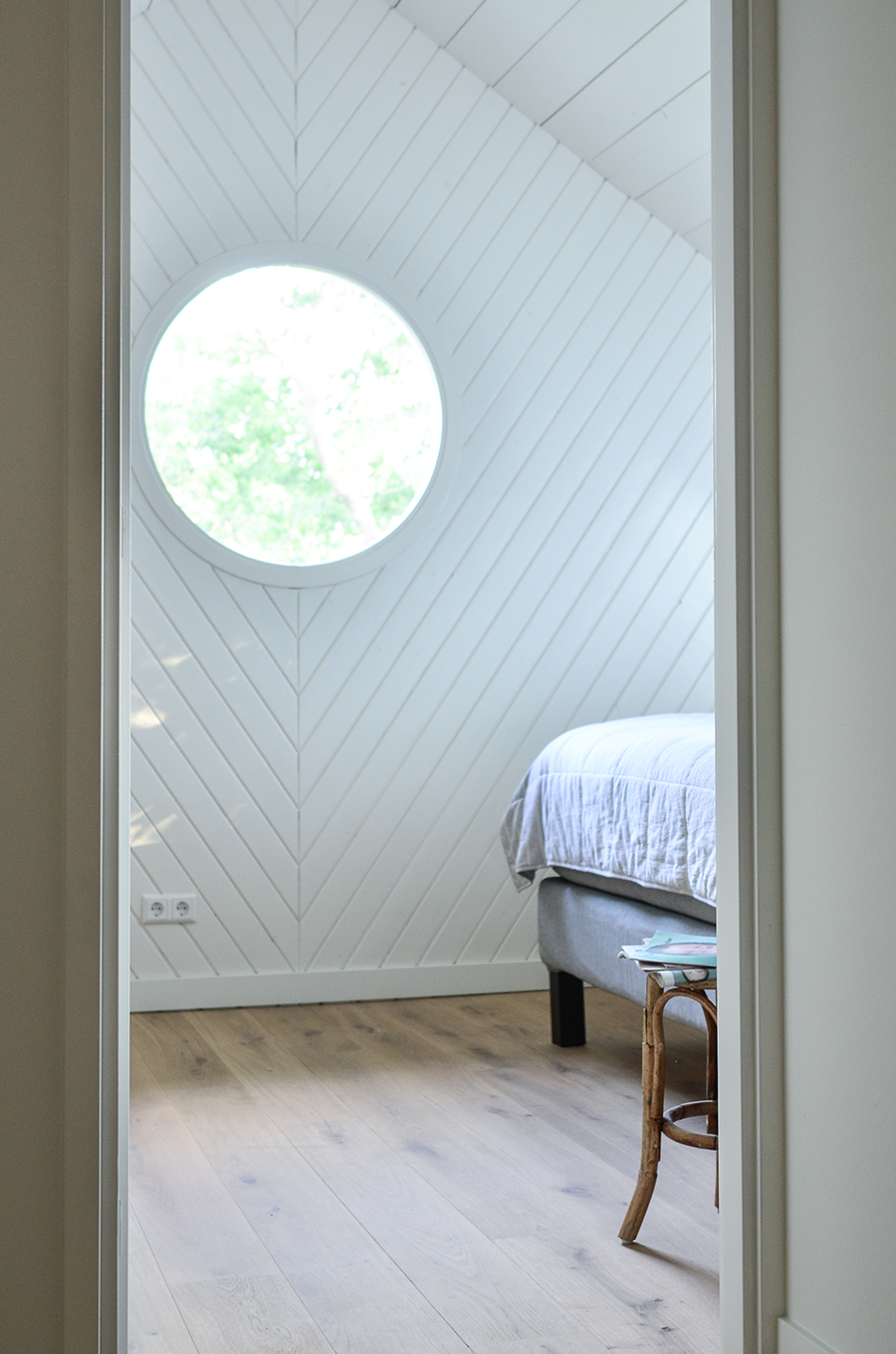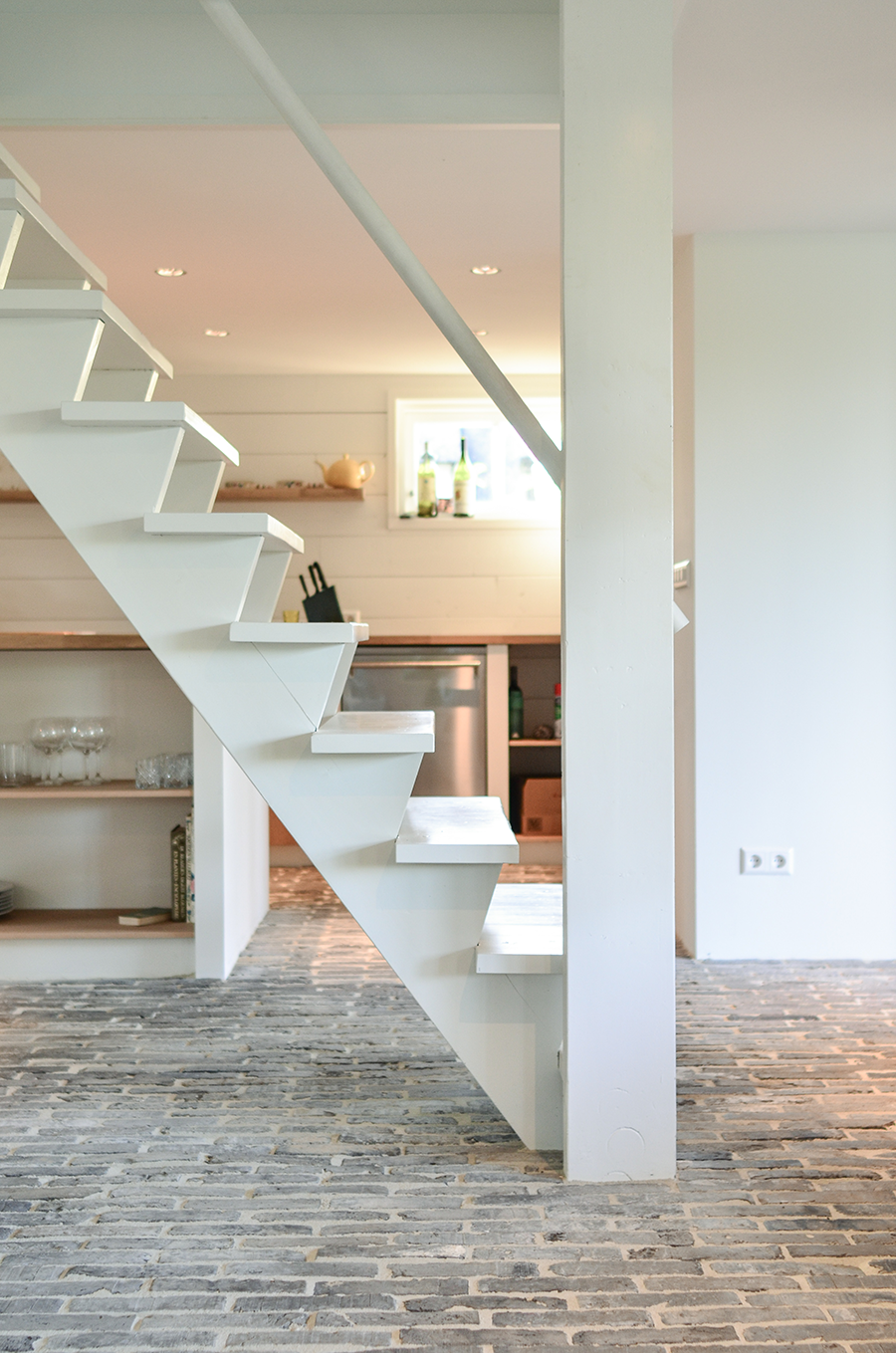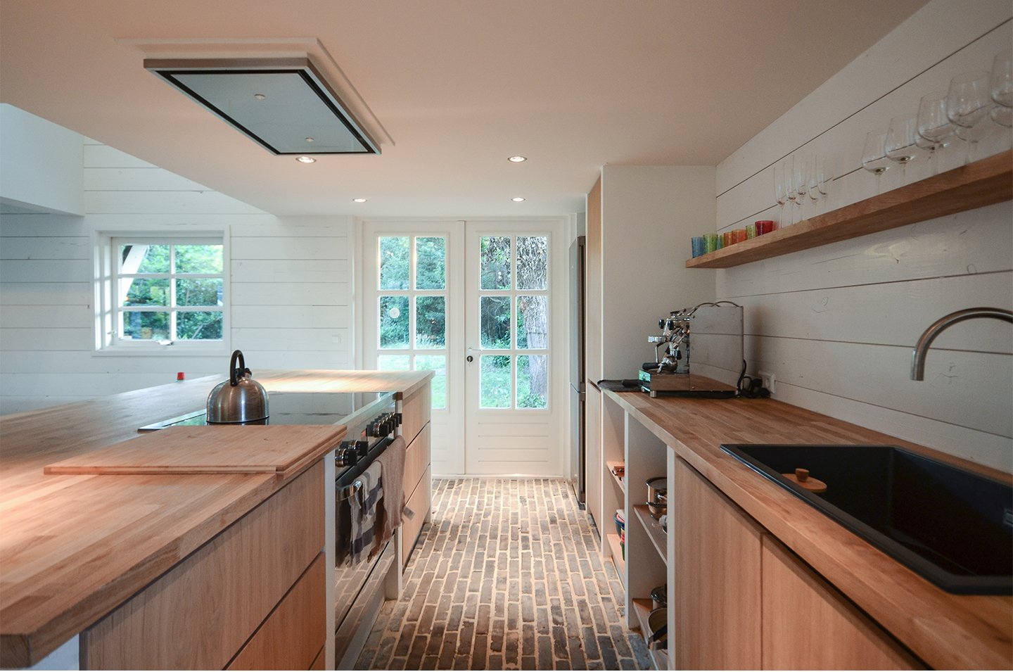 Op de begane grond zijn de muren weg gebroken waardoor een ruime woonkamer met open keuken is ontstaan. Het plafond is open gemaakt om de constructie zichtbaar te maken en tegelijkertijd meer lucht te creëren. De vloer is belegd met gezaagde waaltjes en de muren zijn voorzien van geschilderde houten planken. Er zijn extra toegangen naar het terras gemaakt en ter plaatse van de trap is een vide gezaagd voor een verbinding met de 1e verdieping. Op de eerste verdieping zijn 4 slaapvertrekken gerealiseerd. De masterbedroom is voorzien van een rond venster welke uitzicht geeft op de omliggende natuur. Het dak is hoogwaardig geïsoleerd en net zoals de muren afgetimmerd met geschilderde houten planken. Dit geeft een sterk lijnen spel en levendig karakter aan de woning.